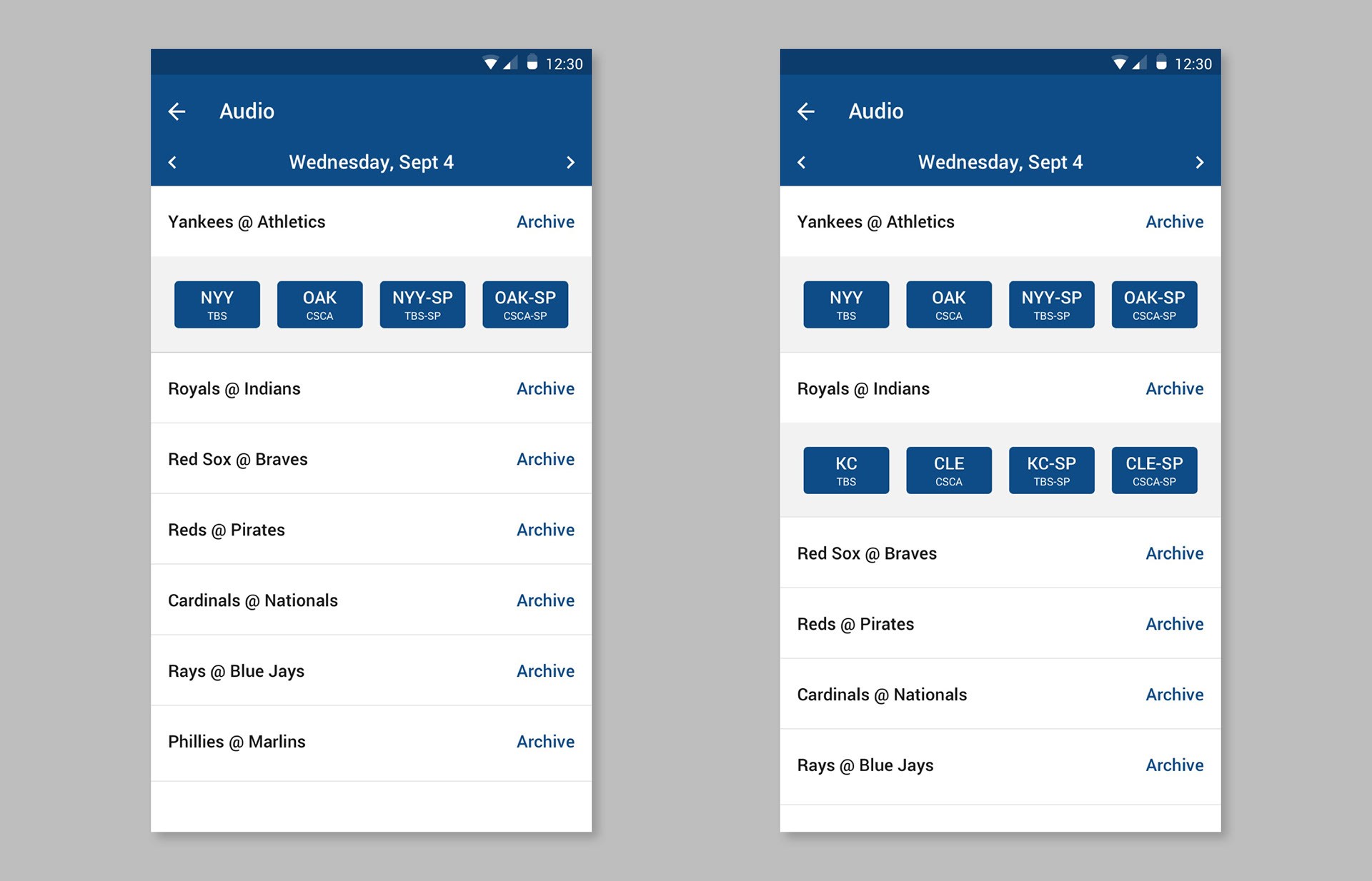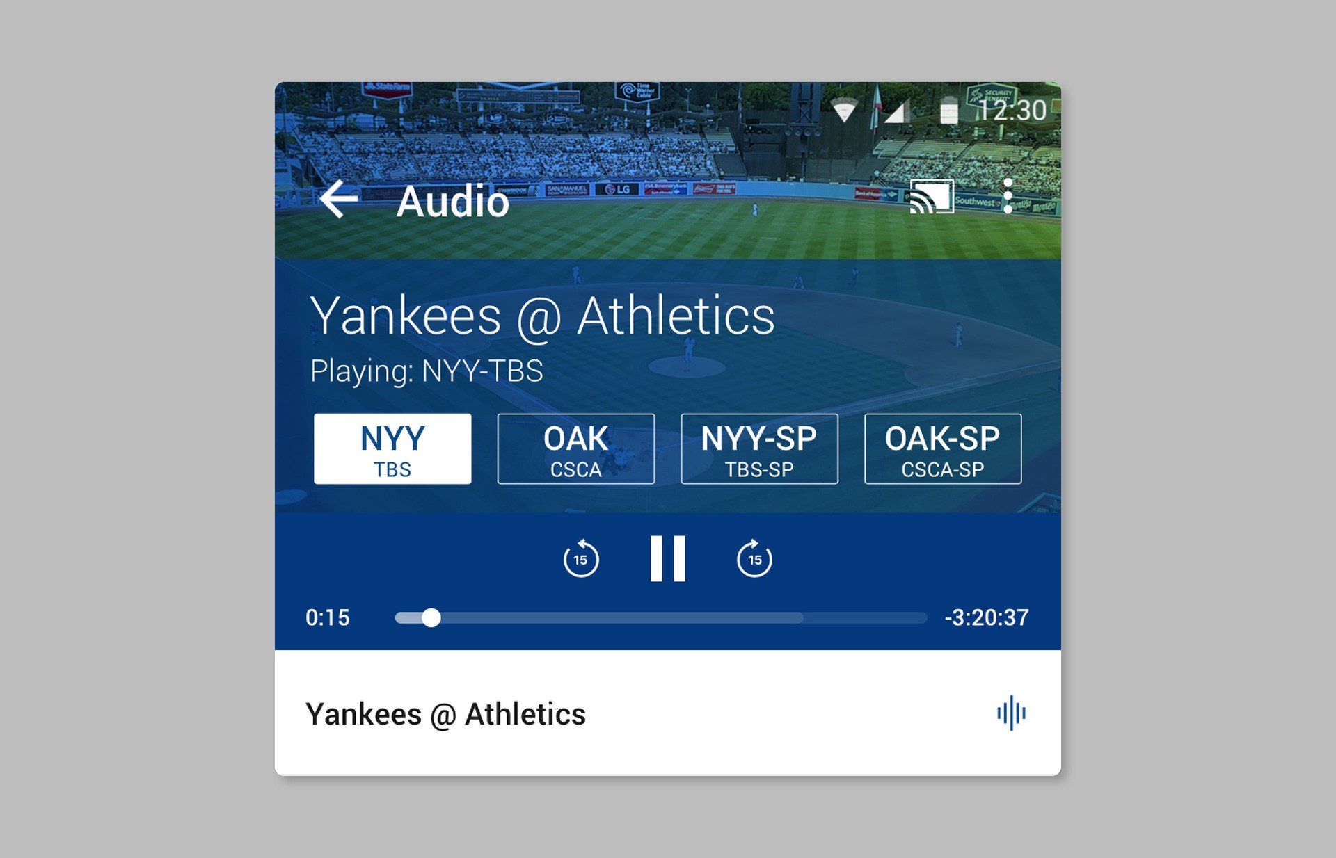 MLB At Bat app is home to team news, scores, and all things baseball. One of the app features is listening to past games. I helped update this experience to improve navigation and add easy access widget to the Android app.