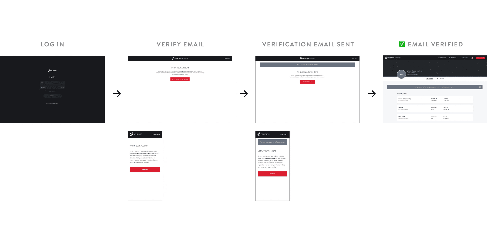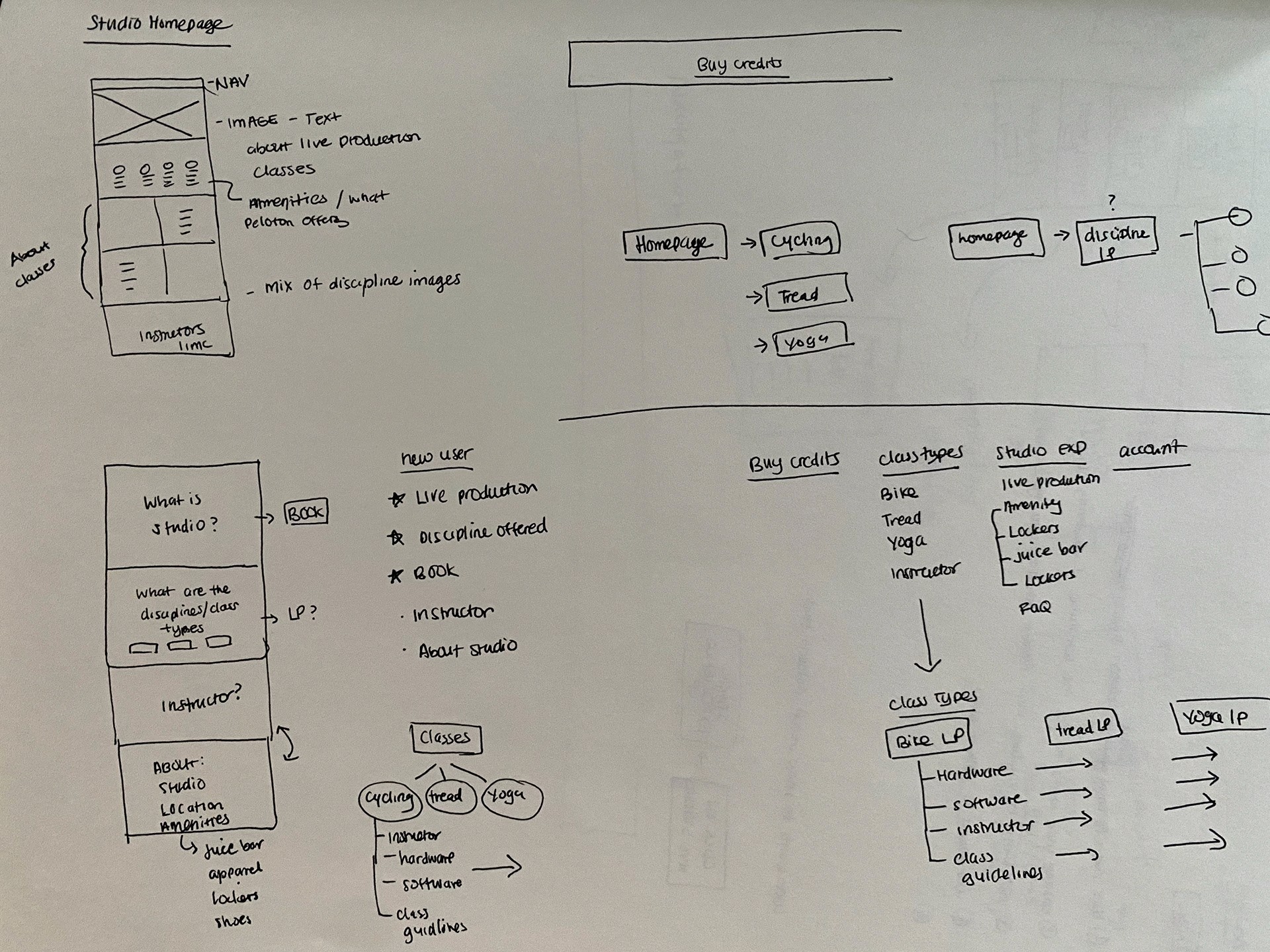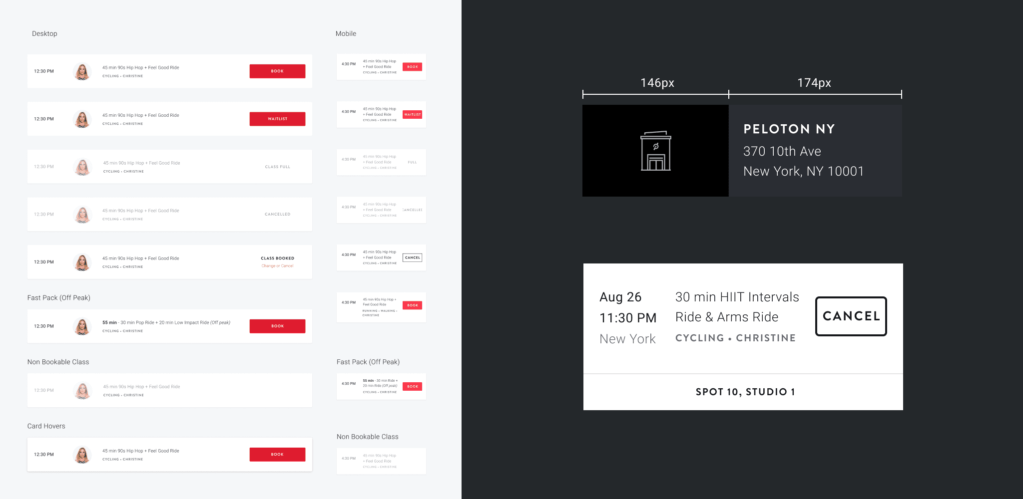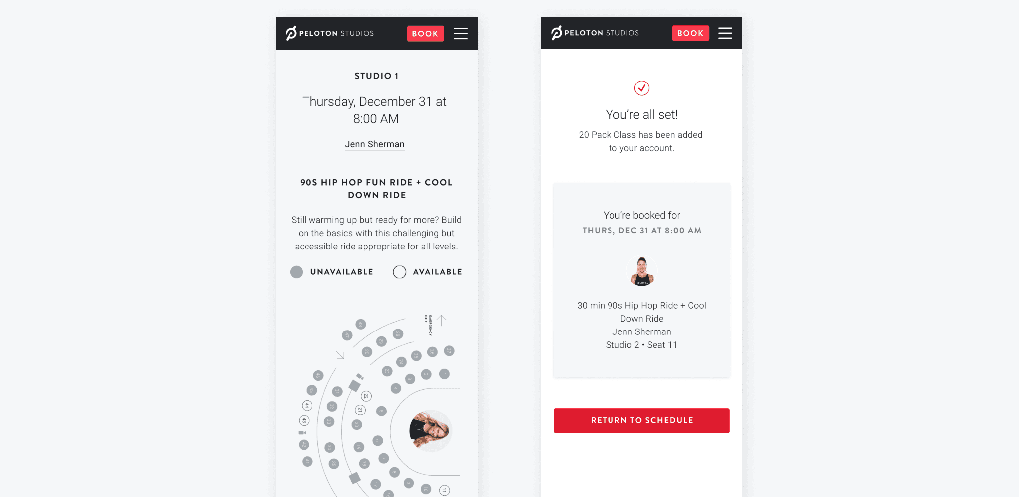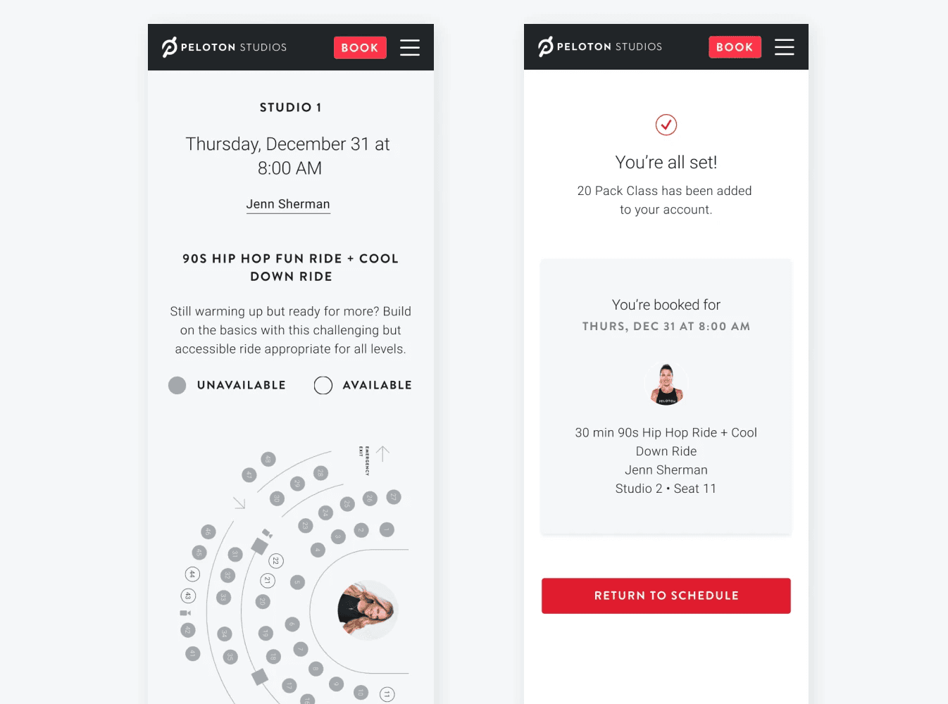 To stay within Peloton's brand, I pulled key components like buttons and color from our UI kit, while crafting additional components. We had weekly reviews with the Studio Member Experience team to get their insights and feedback. Initial feedback came from the members team through their daily interactions with studio members. Some learnings I took away to refocus on the site was to update the confusing class packages and to indicate where the direction of the seat maps to the instructor.