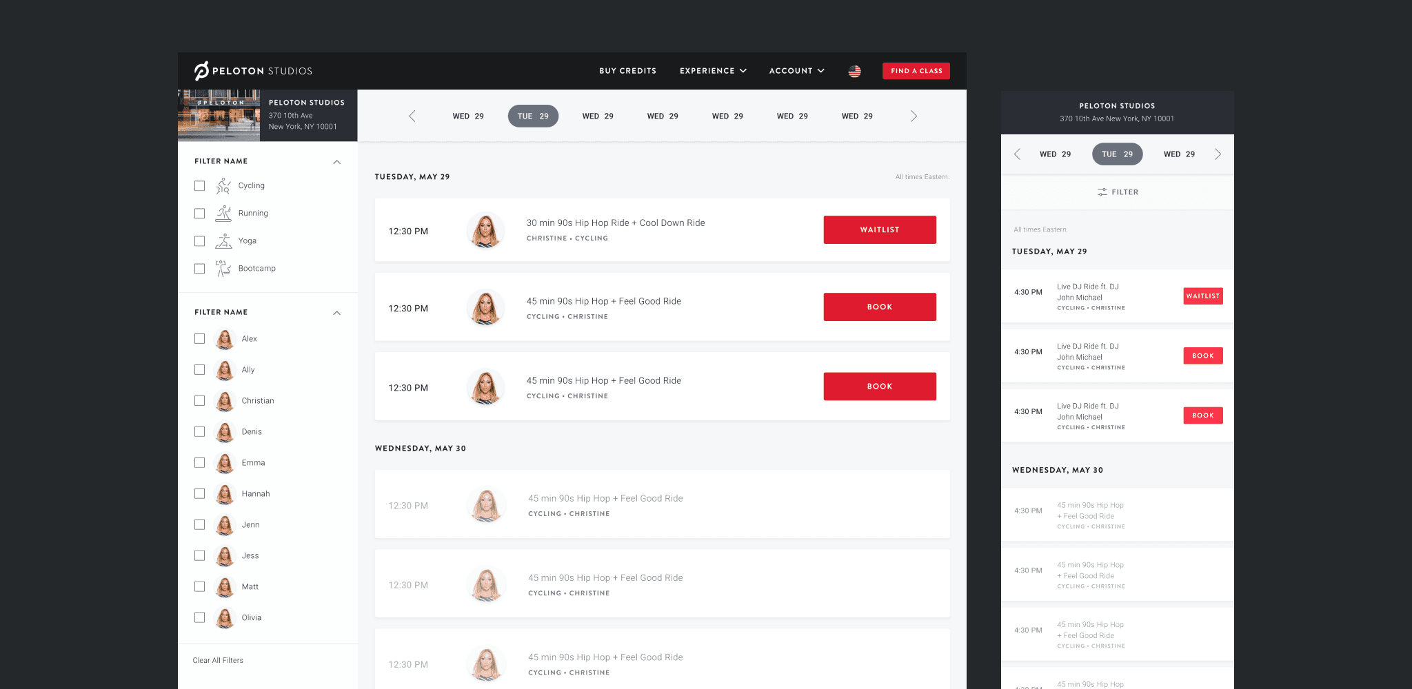 Peloton's reservation system for its studio was managed by Zingfit, a studio management platform. As the e-commerce team grew, discussions to bring the site in-house became high priority. My team and I were tasked to redesign the studio reservation site – a couple of months long project that launched with the opening of the new studio, PSNY (Peloton Studios New York).